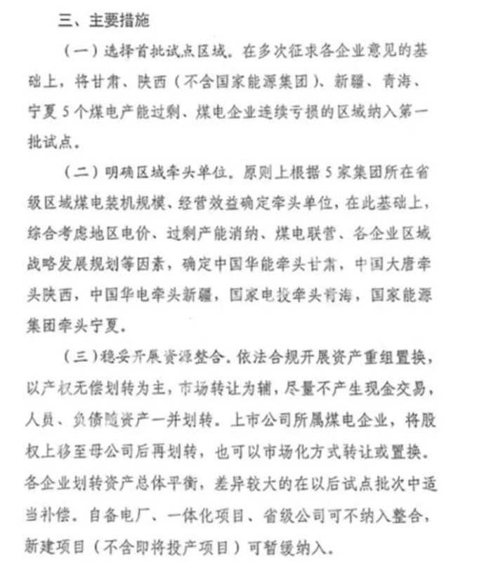 對(duì)A股投資者而言,這輪整合行動(dòng)非常值得研究。本次試點(diǎn)將涉及上市公司資源整合。試點(diǎn)主要措施有:由中國華能牽頭甘肅,中國大唐牽頭陜西,中國華電牽頭新疆,國家電投牽頭青海,國家能源集團(tuán)牽頭寧夏。穩(wěn)妥開展資產(chǎn)重組置換,其中,上市公司所屬煤電企業(yè),將股權(quán)上移至母公司后再劃轉(zhuǎn),也可以市場(chǎng)化方式轉(zhuǎn)讓或置換。