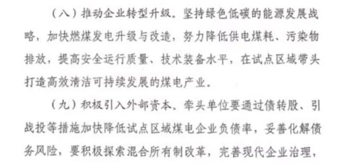同時(shí),要推動(dòng)企業(yè)轉(zhuǎn)型升級(jí),在試點(diǎn)區(qū)域帶頭打造高效清潔可持續(xù)發(fā)展的煤電產(chǎn)業(yè)。試點(diǎn)還支持企業(yè)積極引入外部資本,牽頭單位要通過債轉(zhuǎn)股、引戰(zhàn)投等措施加快降低試點(diǎn)區(qū)域煤電企業(yè)負(fù)債率,積極探索混合所有制改革。