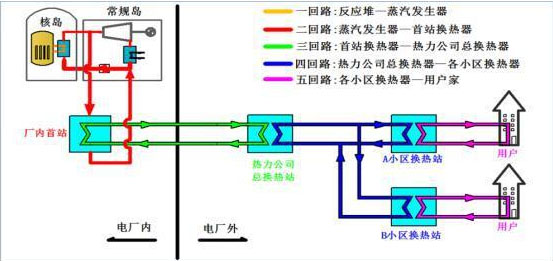 核能供熱,簡而言之,就是從核電機(jī)組中抽取高溫高壓蒸汽作為熱源,采用多級換熱技術(shù),借助換熱站實(shí)現(xiàn)水汽換熱、水水換熱,通過一共五個(gè)回路的運(yùn)行,最后通過市政供熱管網(wǎng)將熱量傳遞給用戶。