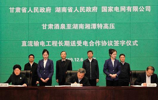 12月6日,甘肅酒泉至湖南湘潭特高壓直流工程長(zhǎng)期送受電合作協(xié)議簽訂儀式在京舉行。國(guó)家電網(wǎng)有限公司和甘肅、湖南兩省政府三方合作協(xié)議的簽訂,是深入貫徹落實(shí)習(xí)近平總書記“四個(gè)革命、一個(gè)合作”能源安全新戰(zhàn)略的積極行動(dòng),將進(jìn)一步提升輸電通道利用效率,更好服務(wù)經(jīng)濟(jì)社會(huì)發(fā)展。國(guó)家能源局黨組成員、副局長(zhǎng)劉寶華,甘肅省委常委、常務(wù)副省長(zhǎng)宋亮,湖南省副省長(zhǎng)吳桂英,公司總經(jīng)理、黨組副書記辛保安出席儀式并講話。公司副總經(jīng)理、黨組成員劉澤洪代表公司簽約。