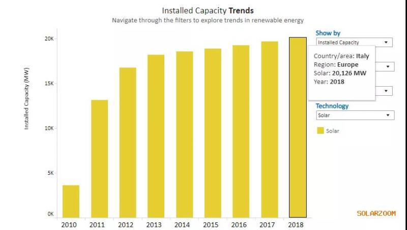 意大利是一個(gè)成熟的光伏市場(chǎng),截止2018年底,意大利累計(jì)光伏裝機(jī)已超過(guò)20GW。2009~2012年期間,意大利光伏裝機(jī)從原來(lái)的1.2GW猛增至16.8GW,隨著2012年起補(bǔ)貼取消,意大利光伏市場(chǎng)受到嚴(yán)重打擊,一蹶不振,自2013~2018年六年來(lái)裝機(jī)僅增長(zhǎng)到了18~19GW的區(qū)間,每年僅增長(zhǎng)300-400MW。