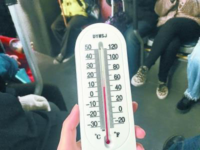 昨天早上8時(shí),室外溫度約為0攝氏度,記者在慈壽寺橋站坐上了85路公交車。上車的瞬間,記者感到迎面而來一陣暖意,但在車廂中部座位坐了幾分鐘之后,這點(diǎn)暖意便消散下去。6分鐘后,溫度計(jì)顯示車廂內(nèi)溫度約為9℃。環(huán)顧四周,幾位老人似乎已經(jīng)習(xí)慣了85路的寒冷,雖然在車?yán)?,但手套、帽子都沒有摘下來;車廂前部一位女士沒有戴手套,一路上只得不停倒換手,留一只手拿著手機(jī),另一只放進(jìn)兜里。記者注意到,車輛窗戶內(nèi)側(cè)的空調(diào)口雖然有一點(diǎn)兒熱度,但是沒有暖風(fēng)吹出。記者坐了13站,在灣子站下車時(shí),溫度計(jì)仍顯示車廂內(nèi)溫度不足10攝氏度。