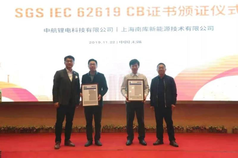 SGS為中航鋰電科技有限公司、上海南庫新能源技術(shù)有限公司頒發(fā) “IEC 62619 CB證書”