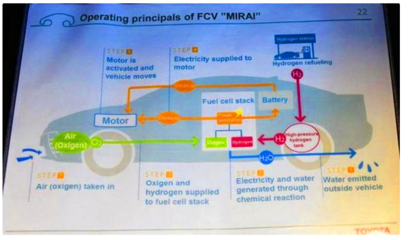 644km,聽到這個(gè)數(shù)字相信很多朋友估計(jì)都會(huì)有一些小小的激動(dòng),畢竟咱們國內(nèi)續(xù)航里程最高的電動(dòng)車差不多也就四五百公里了,而這臺(tái)車一來就是600多公里,這著實(shí)調(diào)動(dòng)了人們的興趣。而說到這臺(tái)豐田Mirai的原理其實(shí)也很簡(jiǎn)單,它利用空氣中的氧氣(綠色)以及氣罐內(nèi)的氫氣(紅線)在發(fā)電裝置內(nèi)發(fā)生反應(yīng),產(chǎn)生的電能(橙線)輸送給電動(dòng)機(jī)用于驅(qū)動(dòng)車輛,剩余的電能則儲(chǔ)存在電池中,用于車輛急加速或?yàn)檐嚿系挠秒娫O(shè)備供電。化學(xué)反應(yīng)之后產(chǎn)生的水(藍(lán)線)直接排除車外即可。