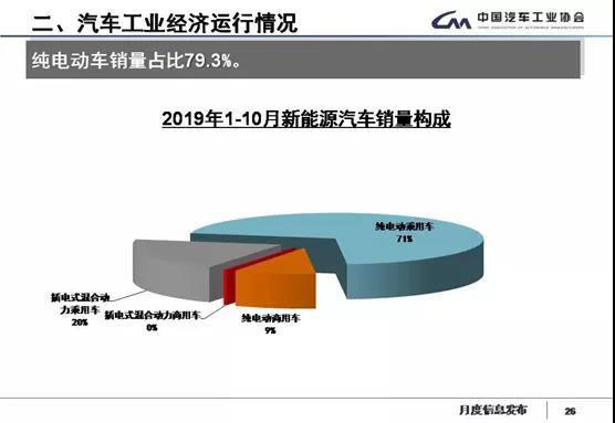 在1-10月新能源汽車銷量構(gòu)成方面,純電動乘用車占總銷量的71%,插電式混合動力乘用車占總銷量20%,純電動商用車占總銷量9%。