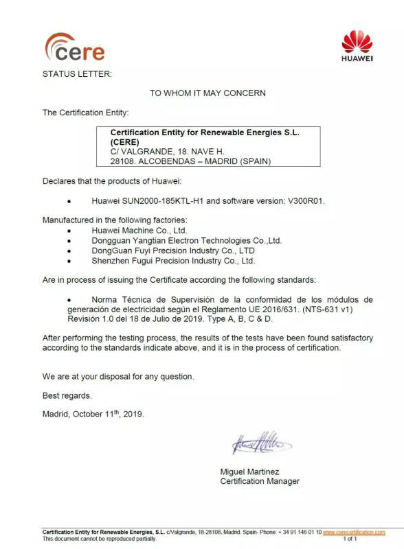 華為通過西班牙NTS新電網(wǎng)碼認證聲明函