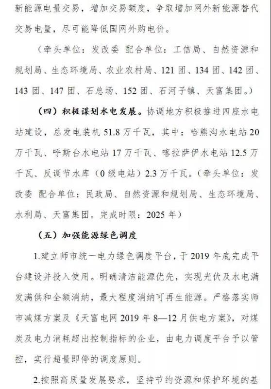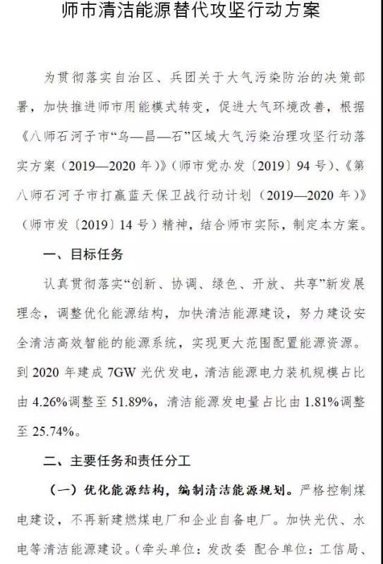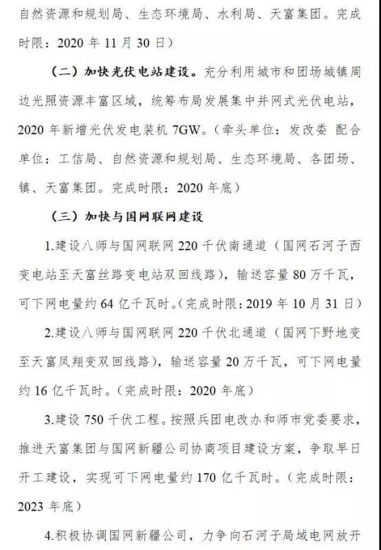 文件中提到,不再新建燃煤電廠和企業(yè)自備電廠,加快光伏、水電等清潔能源建設,利用城市和團場城鎮(zhèn)發(fā)展集中并網(wǎng)式光伏電站,要求2020年底前完成新增7GW裝機任務。