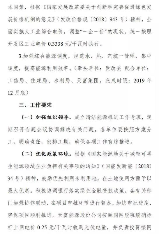 文件還明確了一系列優(yōu)化政策環(huán)境的條件,包括明確清潔能源優(yōu)先,實現(xiàn)光伏及水電滿發(fā)滿供和全額消納;鼓勵優(yōu)先利用未利用地,在土地使用方面予以最大優(yōu)惠;積極協(xié)調(diào)銀行落實綠色金融貸款政策;天富能源股份有限公司按照國網(wǎng)脫硫脫硝標桿上網(wǎng)電價0.25元/千瓦時收購光伏發(fā)電量,并負責投資接網(wǎng)工程及建成后的統(tǒng)一運行維護管理。