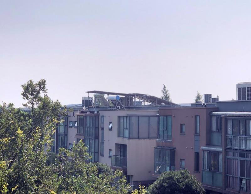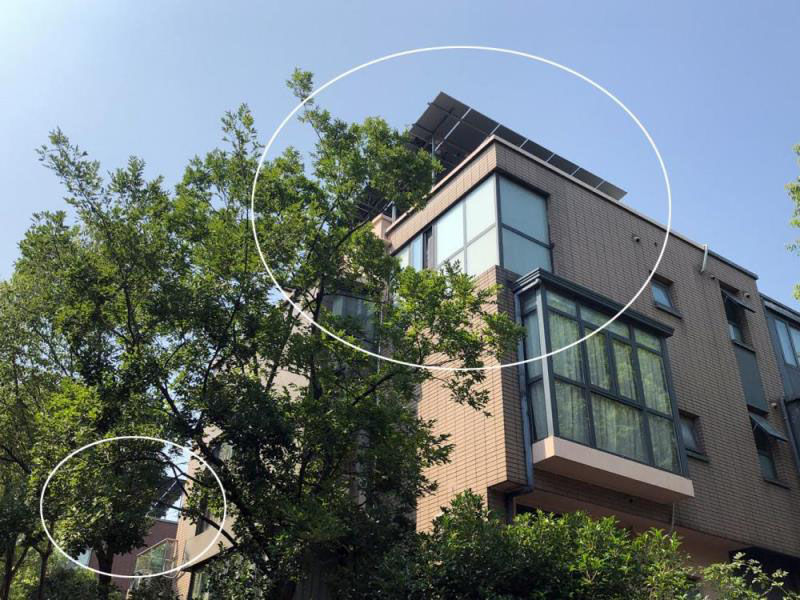 站在后排別墅的3樓露臺上,更能一睹491號屋頂電池板的全貌。整塊電池板傾斜角度大約在20度,北端最高處足有2米高,亮晃晃豎在別墅樓頂頗為突出扎眼。后排別墅居民陳女士告訴記者,原本前排別墅樓頂非常平坦,在小區(qū)高大綠化掩映之下,從后排別墅露臺看出去視野開闊,毫無遮擋。但如今,一開窗視線就難以從前方的太陽能電池板上移開,“景致全被破壞了,讓人難以接受?!?
