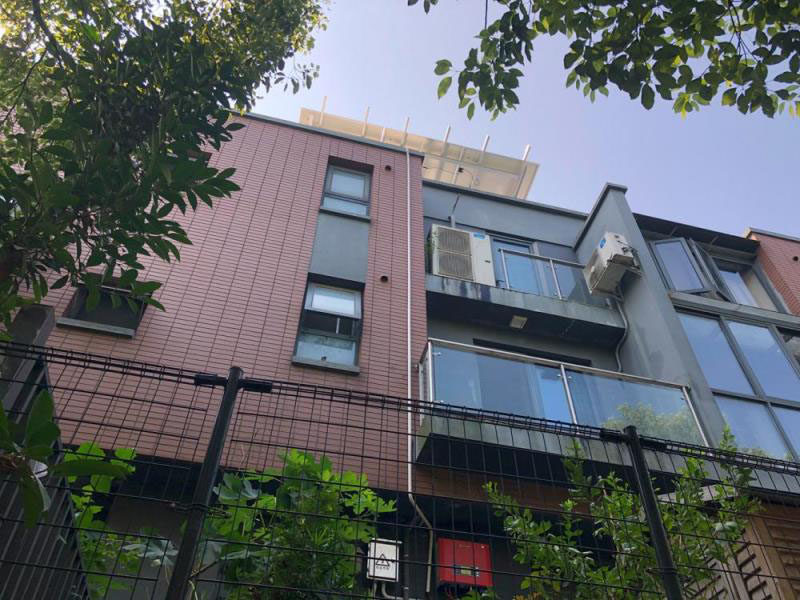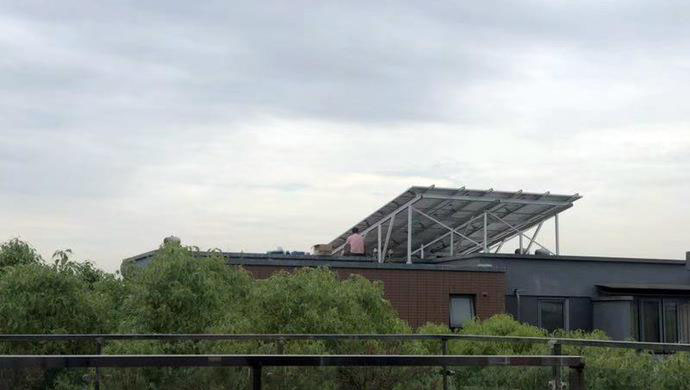 8月14日,記者前往明中路1010號白馬花園了解情況。白馬花園是一個公寓樓和3層樓聯(lián)排別墅混合的小區(qū),安裝太陽能電池板的491號,位于小區(qū)中央位置一排聯(lián)排別墅的西起第二間。站在491號樓底后側(cè),抬頭就能看到樓頂架起來的太陽能電池板。整塊電池板架在銀色方形鐵管制作而成的架子上,面向南方,呈北高南低傾斜。從下方看起來,整塊電池板的寬度幾乎覆蓋了整個別墅的屋頂。