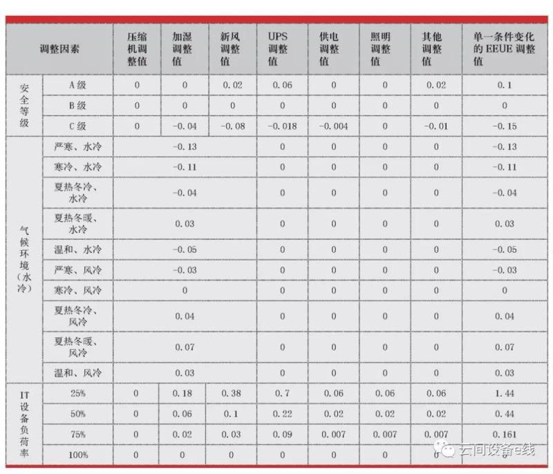 2016年我國發(fā)布的GB/T32910-2016《數(shù)據(jù)中心資源利用第3部分:電能能效要求和測量方法》提出了EEUE指標(biāo),定義與PUE相同。同時(shí),為了方便不同數(shù)據(jù)中心的能耗指標(biāo)進(jìn)行比較,該國標(biāo)考慮了數(shù)據(jù)中心安全等級(jí)、氣候條件和IT設(shè)備負(fù)荷率等因素,提出了調(diào)整模型。不同數(shù)據(jù)中心在比較EEUE時(shí),需使用EEUE修正值。EEUE修正值計(jì)算公式如下: