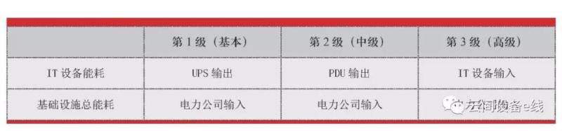 TGG給出了PUE計(jì)算時(shí)的三種測量采集方法。數(shù)據(jù)中心總耗電量Pt都是電力公司對(duì)數(shù)據(jù)中心的輸入。如果數(shù)據(jù)中心所在的建筑物是多用途的,必須對(duì)數(shù)據(jù)中心的總耗能進(jìn)行識(shí)別,需要減去辦公區(qū)域的用電。但是用于數(shù)據(jù)中心技術(shù)支持的總控中心的用電必須包括在內(nèi)。IT設(shè)備總耗電量PIT的采集點(diǎn)有三種:第1級(jí)是基本級(jí)別,采集點(diǎn)是UPS的輸出;第2級(jí)是中級(jí)級(jí)別,采集點(diǎn)是機(jī)房內(nèi)配電柜的輸出;第3級(jí)是高級(jí)級(jí)別,采集點(diǎn)是機(jī)柜內(nèi)電源插座的輸出,也就是IT設(shè)備的輸入,具體見表1。這三種計(jì)算方法的采集點(diǎn)對(duì)電力使用的功耗或電量的采集的顆粒度要求逐級(jí)提高。目前,我國多數(shù)數(shù)據(jù)中心采用的是第1級(jí)的采集和計(jì)算方式。因此,得到的PUE數(shù)值也比第2級(jí)和第3級(jí)數(shù)值更低。