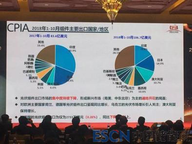 組件出口方向,集中度繼續(xù)了前幾年的趨勢(shì),在逐漸降低。印度市場(chǎng)占3成,今年砍掉一半,日本也下降了10個(gè)百分點(diǎn)。很多新興市場(chǎng)也在發(fā)展當(dāng)中。