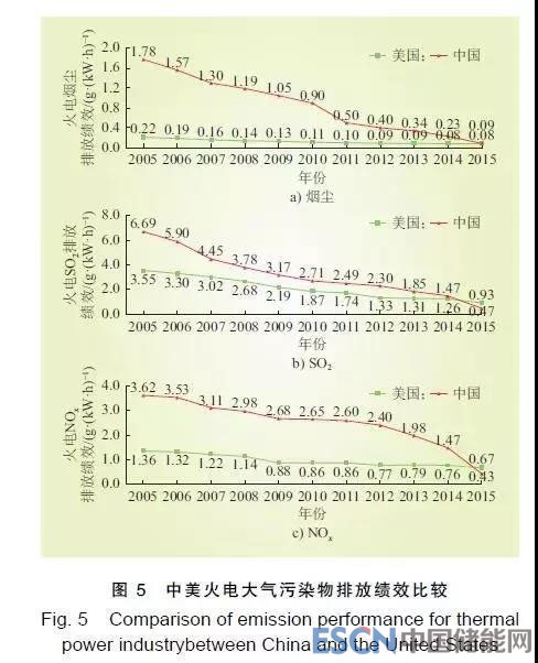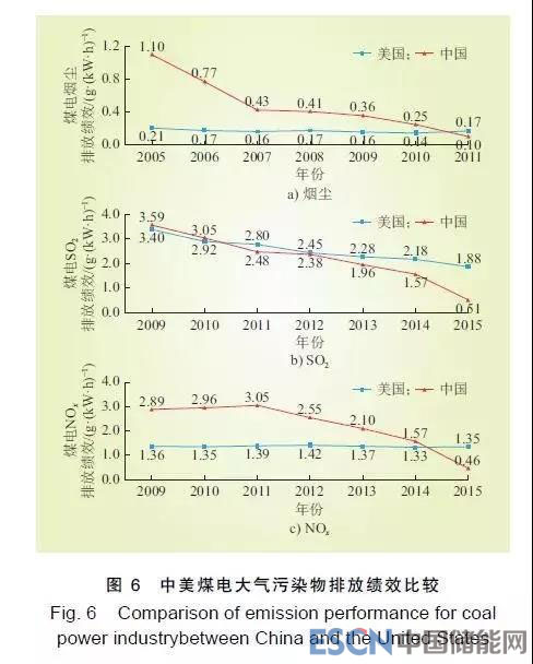 2009—2015年中美煤電大氣污染物排放績效比較如圖6所示。
