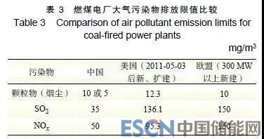 中國燃煤電廠超低排放限值與美國、歐盟燃煤電廠最嚴(yán)格的排放限值比較如表3所示。