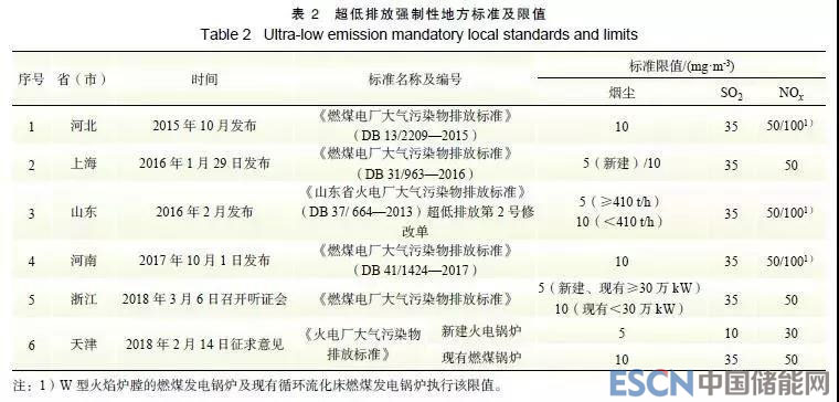 截至發(fā)稿時(shí),已有6個(gè)省級政府發(fā)布或即將發(fā)布火電廠或燃煤電廠大氣污染物強(qiáng)制性地方標(biāo)準(zhǔn), 將超低排放要求標(biāo)準(zhǔn)化, 它們分別是河南、河北、上海、山東、浙江、天津,其中天津市2018年2月發(fā)布《火電廠大氣污染物排放標(biāo)準(zhǔn)》(征求意見稿),浙江省于2018年3月6日召開了《燃煤電廠大氣污染物排放標(biāo)準(zhǔn)》聽證會,其他4個(gè)省份的地方標(biāo)準(zhǔn)均已發(fā)布。上海、山東、浙江對新建鍋爐或一定規(guī)模以上鍋爐的煙塵提出了5mg/m3的燃?xì)鈽?biāo)準(zhǔn)限值要求,其他省份提出的標(biāo)準(zhǔn)限值與國家“超低排放”限值基本一致,詳見表2。另外,值得注意的是上海、浙江強(qiáng)制性地方標(biāo)準(zhǔn)中要求燃煤發(fā)電鍋爐應(yīng)采取煙溫控制及其他有效措施消除石膏雨、有色煙雨等現(xiàn)象;浙江省還將排放績效控制要求寫入強(qiáng)制性地方標(biāo)準(zhǔn)中。