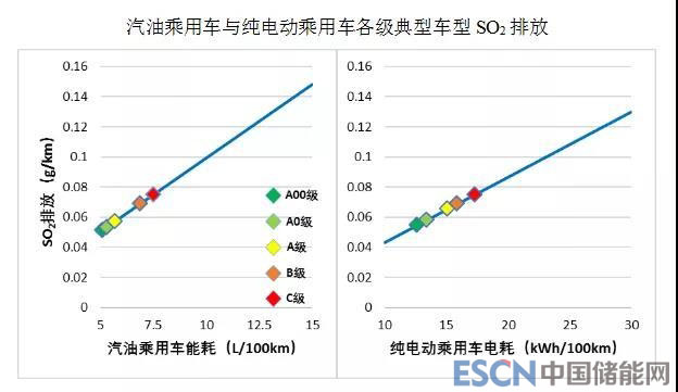 對(duì)于A00級(jí)、A0級(jí)和A級(jí)純電動(dòng)乘用車(chē)的典型車(chē)型,SO2的排放因子分別比同級(jí)別汽油乘用車(chē)高8%、10%和15%,而對(duì)于B級(jí)和C級(jí)車(chē)的典型車(chē)型,純電動(dòng)乘用車(chē)的SO2排放與汽油乘用車(chē)基本相當(dāng);當(dāng)A00級(jí)、A0級(jí)和A級(jí)純電動(dòng)乘用車(chē)的能耗分別低于11.7 kWh/100km、12.2 kWh/100km和13.1 kWh/100km時(shí),SO2的排放將低于同級(jí)別的汽油乘用車(chē)。