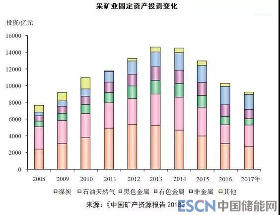 在采礦業(yè)固定投資方面,石油與天然氣開采業(yè)固定投資在2014年達(dá)到4023 億元后連續(xù)兩年下降,2017年投資為26