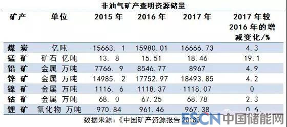 2017年,在與儲(chǔ)能領(lǐng)域密切相關(guān)金屬礦物中,錳礦查明資源儲(chǔ)量最大,達(dá)18.46億噸;鋰礦、鎳礦、鈷礦的儲(chǔ)量依次為967.38萬噸、118.07萬噸、68.78萬噸。