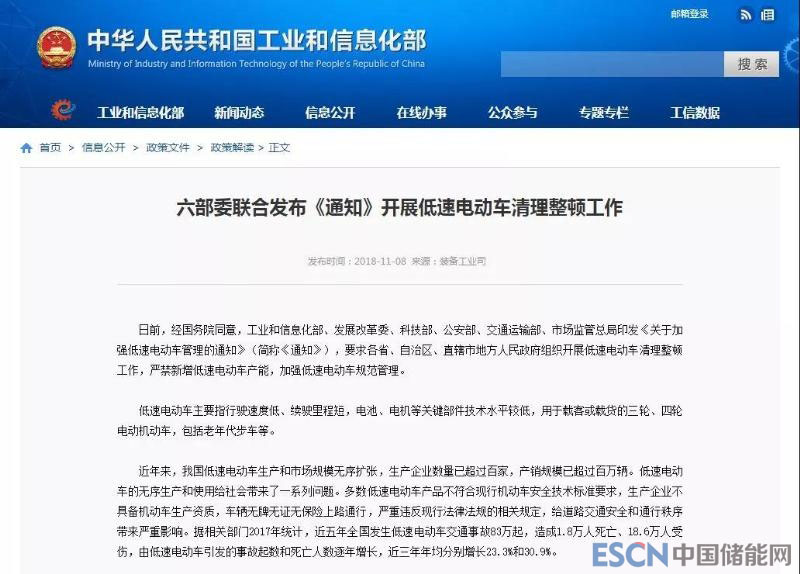 中國(guó)儲(chǔ)能網(wǎng)訊:工信部官方網(wǎng)站剛剛(11月8日)發(fā)布信息稱,經(jīng)國(guó)務(wù)院同意,工信部等六部委印發(fā)了《關(guān)于加強(qiáng)低速電動(dòng)車(chē)管理的通知》,要求各省、自治區(qū)、直轄市地方人民政府組織開(kāi)展低速電動(dòng)車(chē)清理整頓工作,嚴(yán)禁新增低速電動(dòng)車(chē)產(chǎn)能,加強(qiáng)低速電動(dòng)車(chē)規(guī)范管理。