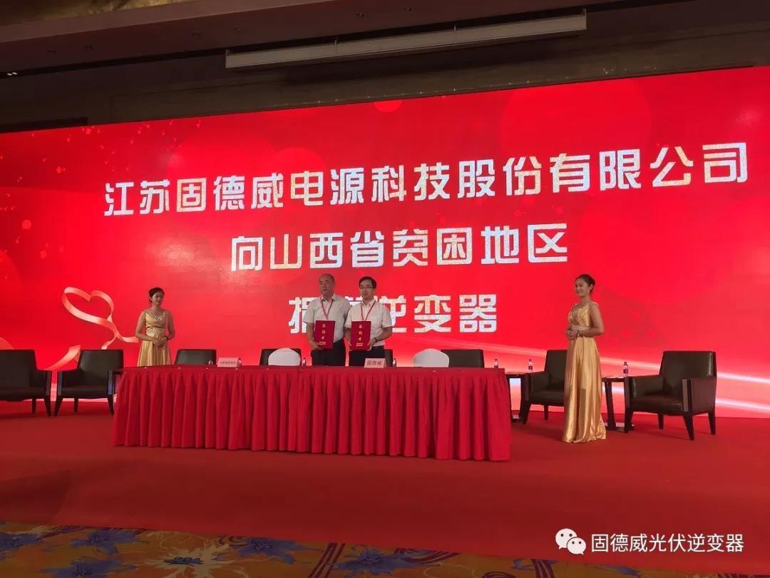 副總經(jīng)理侯祥勇先生(右)代表固德威向山西省貧困地區(qū)捐贈光伏逆變器