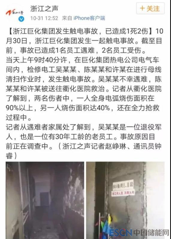 中國儲能網(wǎng)訊:當天上午9時40分許,在巨化集團熱電公司電氣車間內(nèi),檢修電工吳某某、陳某某和許某在進行母線清掃作業(yè)時,發(fā)生觸電事故。吳某某不幸遇難,陳某某和許某被送往衢化醫(yī)院救治。記者從衢化醫(yī)院了解到,兩名傷者中,一人全身電弧燒傷面積在90%以上,另一人燒傷面積達40%,還在全力搶救過程中。