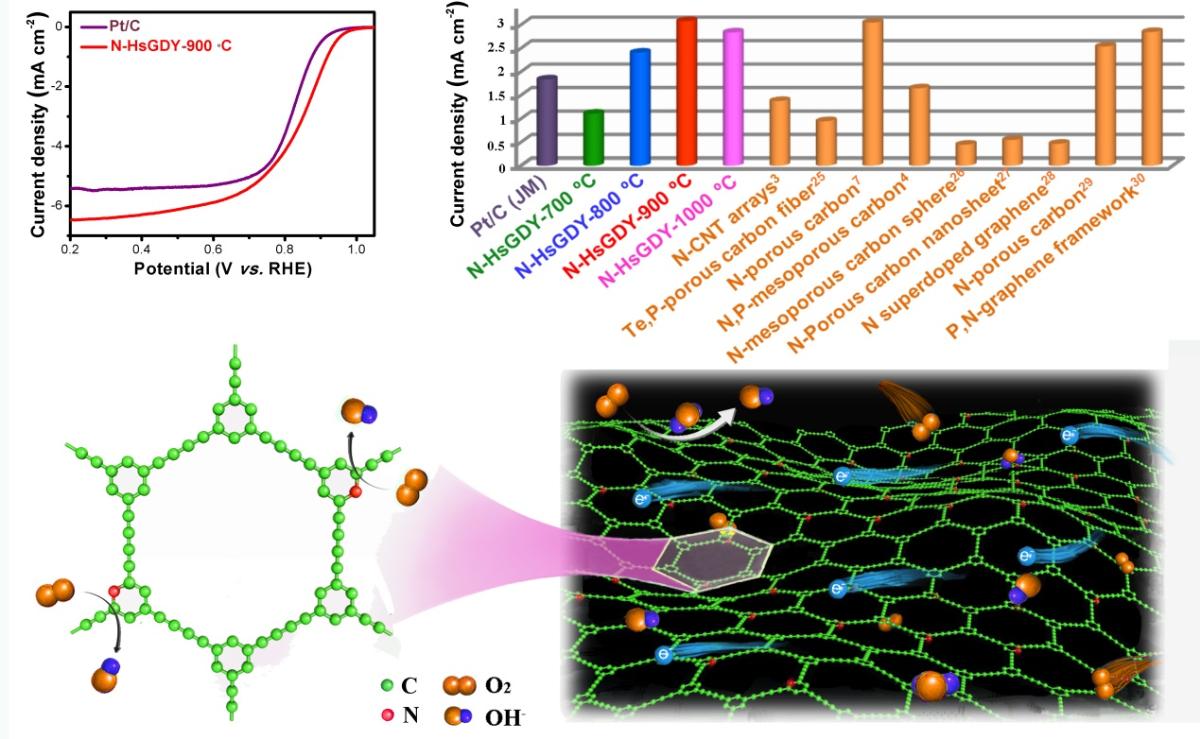 得益于HsGDY的獨特結(jié)構(gòu),在對其進行后處理過程中,碳基材料與能源應(yīng)用研究組準確控制了氮的摻入類型,選擇性摻入對燃料電池陰極電催化最有效的吡啶氮原子,從而實現(xiàn)了優(yōu)異的催化性能。同時,HsGDY具有六邊形的大孔,其分子孔徑達1.63 nm,有利于催化反應(yīng)過程中反應(yīng)物和產(chǎn)物的傳質(zhì)。通過電化學測試發(fā)現(xiàn),吡啶氮摻雜的HsGDY在堿性條件下表現(xiàn)出了優(yōu)于商業(yè)碳載鉑催化劑的超高活性。其在0.85 V電位下的電流密度為商業(yè)碳載鉑催化劑的1.6倍,同時具有比碳載鉑更好的穩(wěn)定性和抗甲醇中毒能力。吡啶氮摻雜的HsGDY作為新型燃料電池陰極催化劑替代傳統(tǒng)鉑基催化劑,展現(xiàn)了巨大的潛力。這種通過碳材料結(jié)構(gòu)設(shè)計,實現(xiàn)異原子的準確摻雜的方法,也為制備其他摻雜型納米材料提供了新的思路。