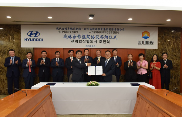 期間9月3日,四川能投與現(xiàn)代自動(dòng)車株式會(huì)社(以下簡稱“韓國現(xiàn)代”)戰(zhàn)略合作框架協(xié)議簽約儀式在韓國首爾舉行。在四川省委副書記、省長尹力,韓國現(xiàn)代汽車集團(tuán)常任顧問、中國事業(yè)主管薛榮興的見證下,四川能投黨委副書記、副董事長、總經(jīng)理王誠,韓國現(xiàn)代副社長、商用事業(yè)部本部長李仁哲代表雙方簽署《戰(zhàn)略合作框架協(xié)議》。四川省經(jīng)信委主任陳新有、省商務(wù)廳廳長劉欣、省投促局局長陳光浩、資陽市政府代市長吳旭、省外辦副主任張濤,韓國駐成都總領(lǐng)事張?zhí)阚?,韓國現(xiàn)代社長韓成權(quán)、副社長李丙皓、商用銷售服務(wù)室室長敘碩教、商用企劃室室長李載澈出席簽約儀式。