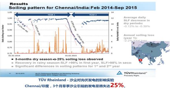 地面電站廣泛分布在西北、華北等地,周圍環(huán)境大多為荒山、沙漠、灘涂等,運(yùn)維環(huán)境艱苦,運(yùn)維人員流動(dòng)性頻繁,服務(wù)質(zhì)量無法保證。因此,目前大多數(shù)集中式大型地面電站積灰嚴(yán)重,影響發(fā)電效率。杜克大學(xué)公民與環(huán)境工程教授曾表示,在灰塵較多、較為干旱的地區(qū),如果每月清洗一次電池板,則沉積的塵埃使太陽能電池板發(fā)電效率降低17%-25%;如果每兩個(gè)月清理一次,發(fā)電效率將可能降低25%-35%。