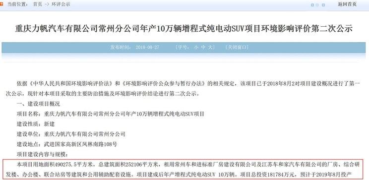 力帆汽車計劃通過租賃車和家江蘇常州工廠,建設(shè)一個年產(chǎn)10萬輛的增程式純電動SUV項目。近日,江蘇環(huán)保公眾網(wǎng)發(fā)布了環(huán)評公示,公示顯示,該項目總投資超18億元,預(yù)計于2019年8月投產(chǎn)。
