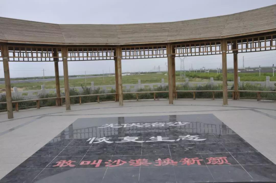 在國(guó)家電投磴口光伏電站的觀景臺(tái)中央,黑色的石板上刻著一句話——“敢叫沙漠換新顏”,而這,也正是國(guó)家電投人光伏治沙的壯志豪情。