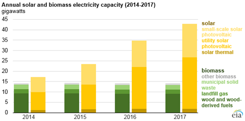 太陽能發(fā)電量的年增長率往往滯后于年裝機量的增長,因為發(fā)電能力往往會在年末增加。 例如,2016年12月,公用事業(yè)規(guī)模的太陽能發(fā)電裝機容量增加了29%,盡管落地項目已被計入年發(fā)電裝機容量的增量之中,但距離其對年發(fā)電量產(chǎn)生貢獻仍還有幾天的時間。 2017年,12月太陽能新增量占全年總量的21%。 總體而言,太陽能技術(shù)的年運營量比生物質(zhì)能技術(shù)更低,且與生物質(zhì)能技術(shù)相比季節(jié)性變化更大。