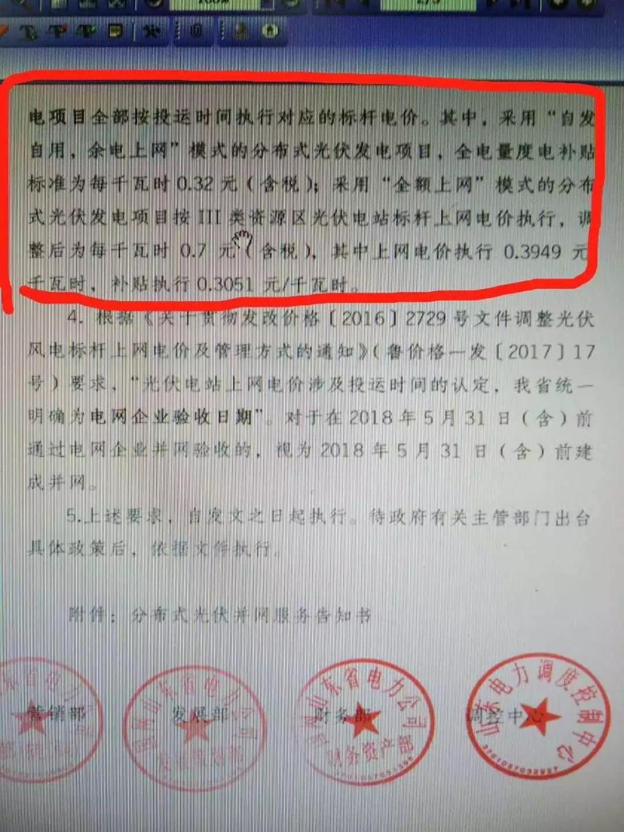 4.根據(jù)《關于貫徹發(fā)改價格[2016]2729號文件調(diào)整光伏風電標桿上網(wǎng)電價及管理方式的通知》(魯價格一發(fā)[2017]17號)要求,“光伏電站上網(wǎng)電價涉及投運時間的認定,我省統(tǒng)一明確為電網(wǎng)企業(yè)驗收日期”。對于在2018年5月31日(含)前通過電網(wǎng)企業(yè)并網(wǎng)驗收的,視為2018年5月31日(含)前建成并網(wǎng)。