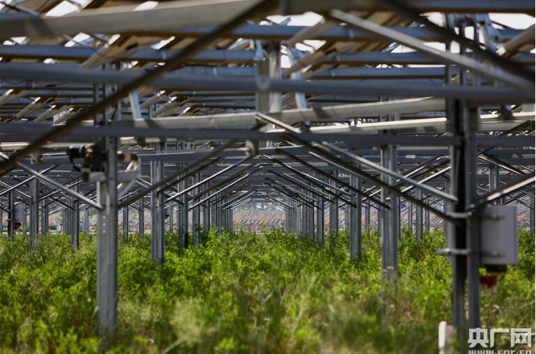 中國(guó)儲(chǔ)能網(wǎng)訊:一條水泥小道,隔出兩方天地。一邊是嚴(yán)重荒漠化的沙漠,寸草不生,風(fēng)吹沙起;一邊是成片墨藍(lán)色的光伏板,傾斜40度仰著天,把吸收的光能轉(zhuǎn)化為電能,底下種滿植物,綠意盎然。