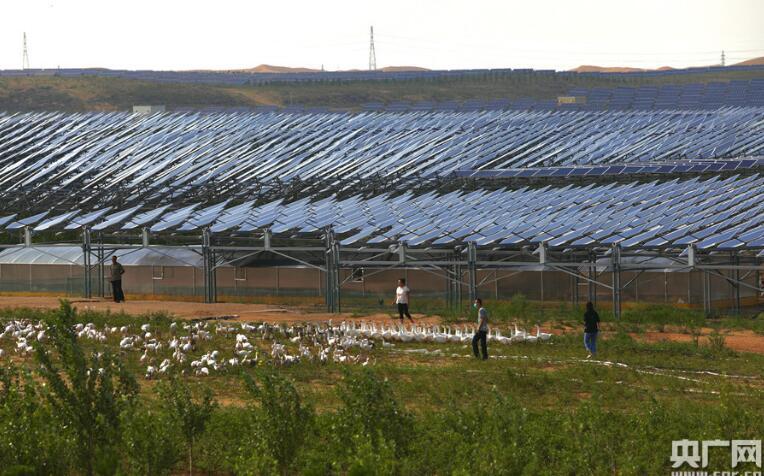 光伏發(fā)電板之間供當(dāng)?shù)?1戶貧困戶養(yǎng)家禽。家禽數(shù)量控制在5000只左右。這既增加了植物和沙地的肥力,又避免家禽過(guò)度食用草木而造成植被破壞。養(yǎng)殖所需水電均由基地免費(fèi)提供,收入由養(yǎng)殖者共享。