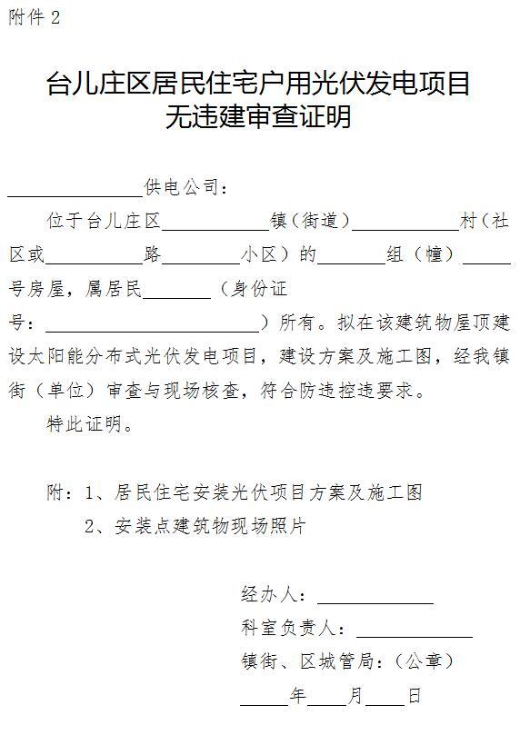 2、臺兒莊區(qū)居民住宅戶用光伏發(fā)電項目無違建審查證明