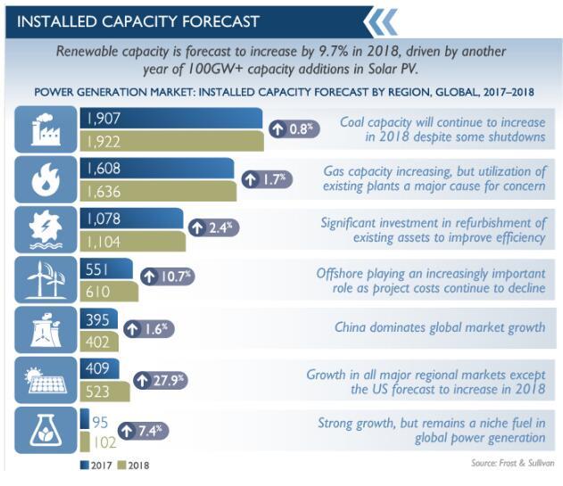 與2017年類似,F(xiàn)rost&Sullivan預計太陽能占投資的大部分,預計2018年為1230.3億美元,中國將成為主要投資方。太陽能和風能(海上)的需求和投資環(huán)境呈現(xiàn)出積極的態(tài)勢。