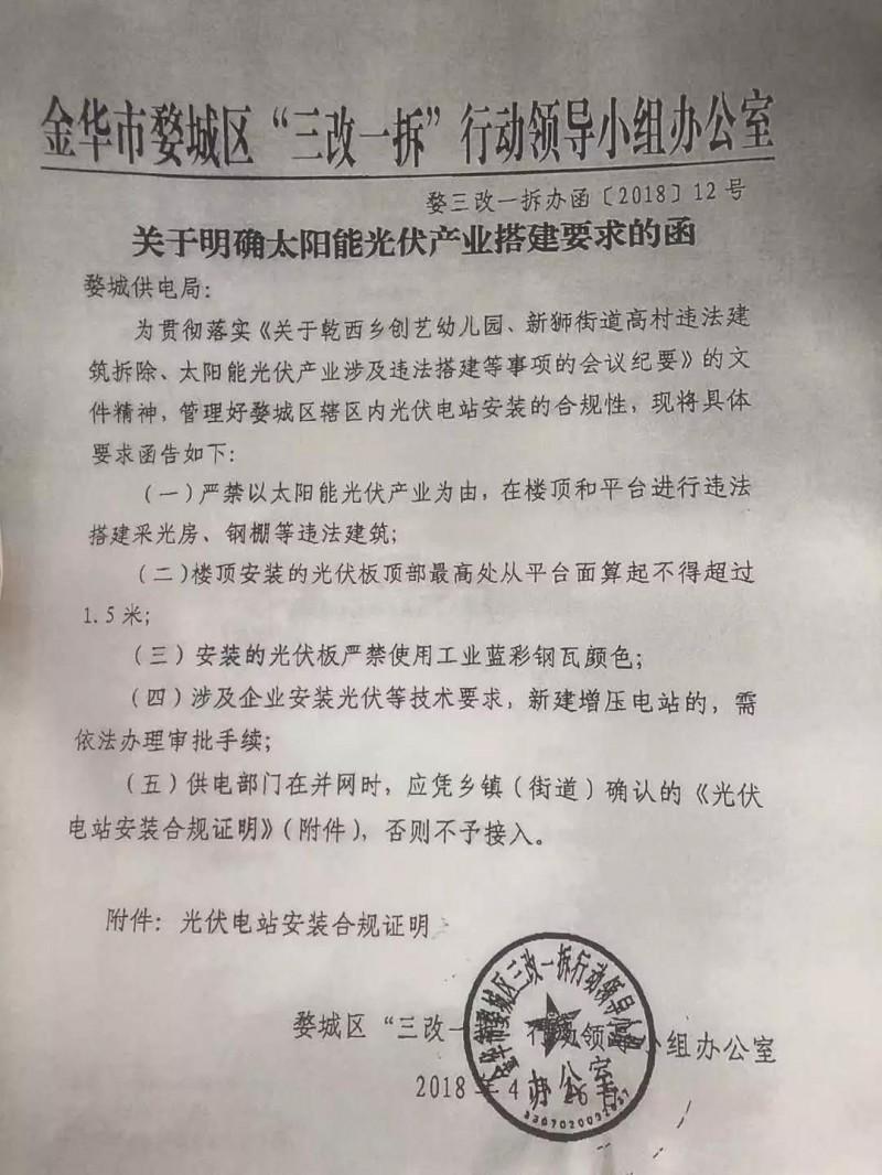 中國(guó)儲(chǔ)能網(wǎng)訊:近日,金華市婺城區(qū)“三改一拆”行動(dòng)領(lǐng)導(dǎo)小組辦公室發(fā)布了《關(guān)于明確太陽(yáng)能光伏產(chǎn)業(yè)搭建要求的函》,對(duì)當(dāng)?shù)毓夥娬窘ㄔO(shè)提出以下要求: