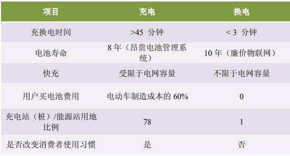 本項目所建設(shè)能源站擬采取自主研發(fā)的“動力電池更換”為主兼顧充電的模式。相較于充電模式,在更換時間、電池壽命、征地占地、投資回收期等方面,換電模式都體現(xiàn)出較為顯著的競爭優(yōu)勢(見下圖)。