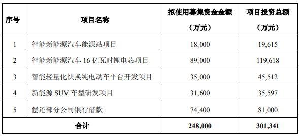 中國儲能網(wǎng)訊:力帆股份5月6日晚間發(fā)布非公開發(fā)行A股股票預(yù)案,擬募集資金總額不超過24.8億元,用于投資智能新能源汽車能源站、智能新能源汽車16億瓦時鋰電芯、智能輕量化快換純電動車平臺開發(fā)等項目,以及償還銀行借款(見下表)。