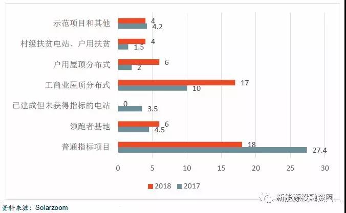 展望2018年,由于指標(biāo)管理政策的嚴(yán)格,已建成但無(wú)法獲取指標(biāo)的項(xiàng)目可能不再出現(xiàn),因此我們認(rèn)為需求端普通指標(biāo)項(xiàng)目(普通集中式、集中式扶貧、地面分布式)會(huì)有所下降大約18GW;領(lǐng)跑者基地規(guī)模會(huì)進(jìn)一步擴(kuò)大,預(yù)計(jì)在6-8GW左右;分布式電站會(huì)延續(xù)高增長(zhǎng),預(yù)計(jì)有23-25GW;光伏扶貧力度將進(jìn)一步增強(qiáng),預(yù)計(jì)有4GW,示范電站和其他項(xiàng)目預(yù)計(jì)4-5GW,因此2018年國(guó)內(nèi)裝機(jī)規(guī)模約為55-60GW,需求依然強(qiáng)勢(shì)。2017和2018年中國(guó)光伏新增裝機(jī)結(jié)構(gòu)對(duì)比見(jiàn)下表(單位:GW)。