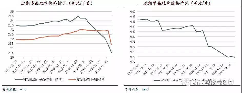 2018年單晶硅片龍頭隆基股份三次調(diào)價(jià),目前單晶硅片國(guó)內(nèi)報(bào)價(jià)4.55元/片、國(guó)外報(bào)價(jià)0.63美元,總降價(jià)達(dá)到0.85元/片。同時(shí)2018年1-2月份多晶硅價(jià)格呈現(xiàn)出明顯的“斷崖式下跌”走勢(shì),2月初開(kāi)始,多晶硅價(jià)格瞬間斷崖式下跌,2月底價(jià)格為12.46萬(wàn)元/噸,降幅高達(dá)18.6%。2月均價(jià)12.96萬(wàn)元/噸,環(huán)比下滑15.3%。電池片和組件的環(huán)節(jié)較為平穩(wěn),我們認(rèn)為經(jīng)過(guò)一季度的淡季,價(jià)格大幅調(diào)整后,在二季度即將迎來(lái)?yè)屟b,各個(gè)環(huán)節(jié)價(jià)格趨于穩(wěn)定。