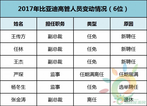 比亞迪在2017年,涉及變動(dòng)的高管人員有6位,其中1位退休,1位任期滿離任,1位選舉聘任,3位新聘任。