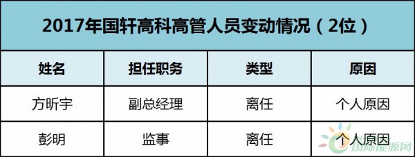 國(guó)軒高科在2017年,涉及變動(dòng)的高管人員有2位,2位均因個(gè)人原因離任。