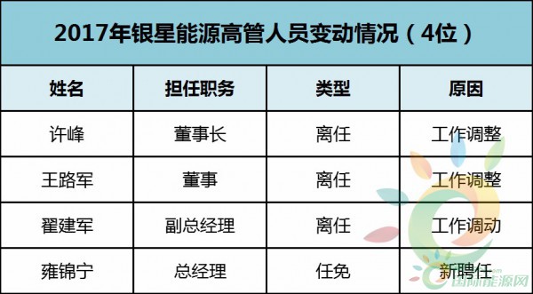 銀星能源在2017年,涉及變動(dòng)的高管人員有4位,其中3位因工作原因離任,1位新聘任。