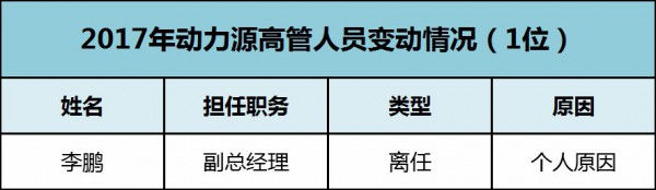 動(dòng)力源在2017年,涉及變動(dòng)的高管人員只有1位,因工作原因離任。