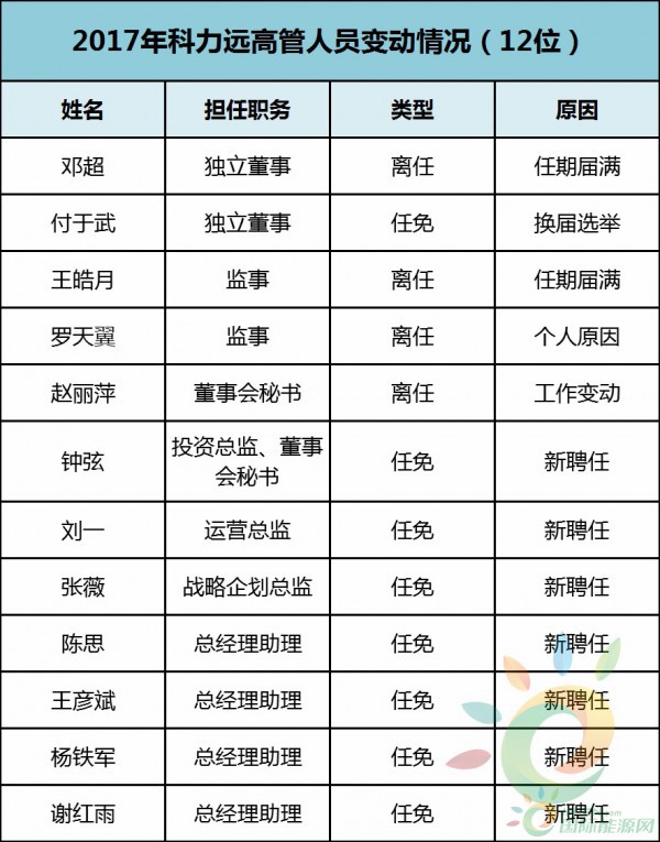 科力遠(yuǎn)在2017年,涉及變動(dòng)的高管人員有12位,其中2位為任期屆滿離任,1位因個(gè)人原因離任,1位因工作原因離任,1位換屆選舉聘任,7位為新聘任。
