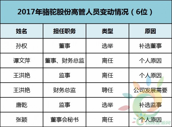 駱駝股份在2017年,涉及變動(dòng)的高管人員有6位,其中3位因個(gè)人原因離任,2位換屆選舉聘任,1位為新聘任。