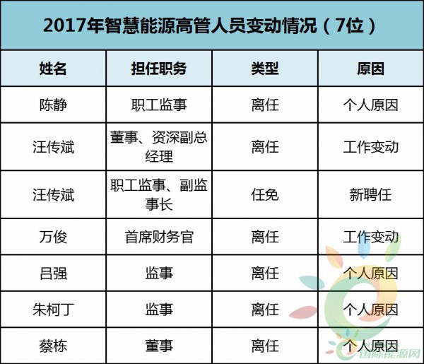 智慧能源在2017年,涉及變動(dòng)的高管人員有7位,其中4位因個(gè)人原因離任,2位因工作原因,1位為新聘任。