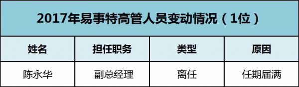 易事特在2017年,涉及變動(dòng)的高管人員有1位,因任期屆滿離任。